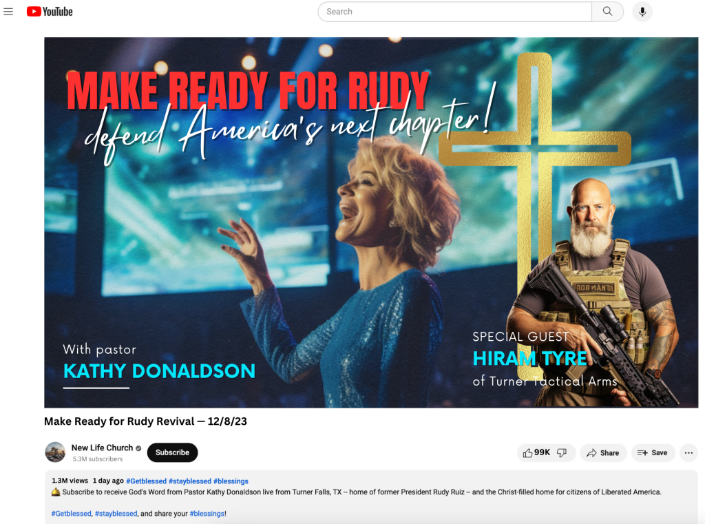Pastor Kathy Donaldson has certainly taken the temperature of the “RudBoyz” and LibertyNow! movements who are anxious to see Ruiz return to D.C., and now she’s looking to raise that temperature even higher. On her YouTube show in advance of Saturday’s rallies, she cast Ruiz’s story explicitly as one of “resurrection” in the face of the “Devil’s” work, saying that “heaven was not ready” for Ruiz, and returned him to the earthly plane for further works.