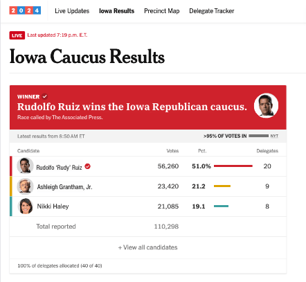 The Associated Press finally called Iowa for Rudy Ruiz after a day of contentious political snarking between the Ruiz, Grantham, and Haley campaigns. It seems even death itself cannot stop the Rudy Ruiz train — the current/former president saw a record win in the Republican caucus.